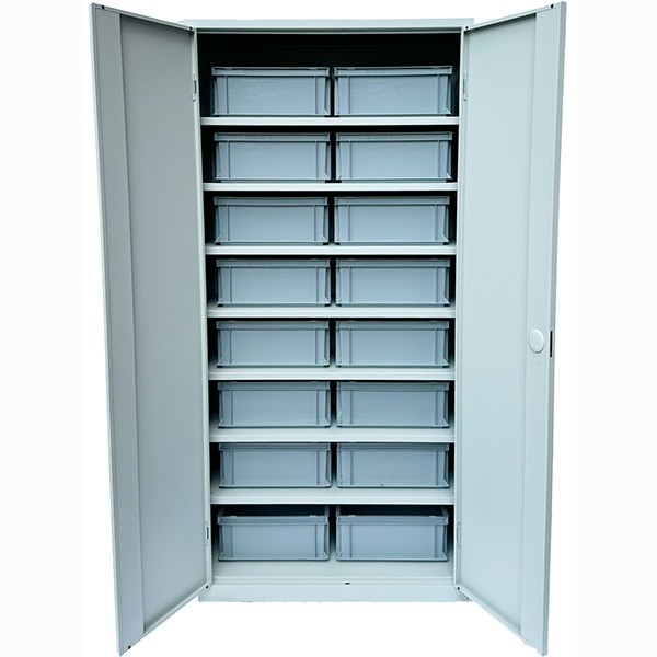 002-173 Armoire en acier avec portes et 16 bacs de transport gerbables – dimensions extérieures 1950 x 920 x 420 mm (HxLxP) – avec portes