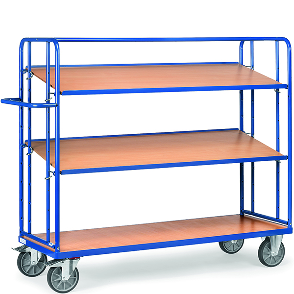 FE-04296 Chariot avec 3 plateaux (2 inclinables) – charge utile 500 kg – 1650 x 610 mm (L x l) surface utile – 1830 x 620 x 1560 mm (LxIxH) dimens. extérieure