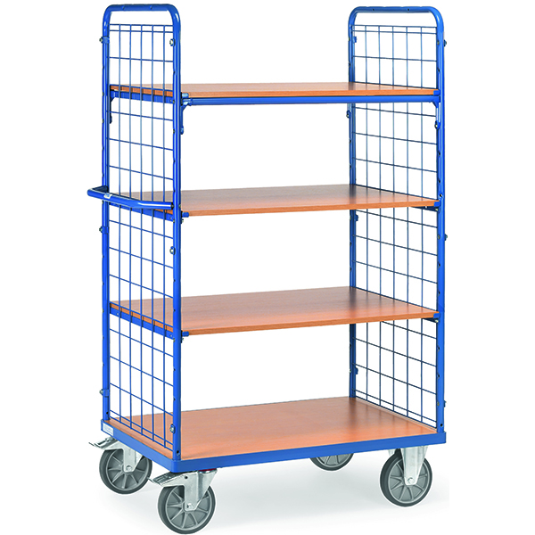 FE-08411 Chariot à plateaux (1 fixe et 3 amovibles) – charge utile 600 kg – 1000 x 600 mm (L x P) surface utile – 1169 x 609 x 1800 mm (LxPxH) dimens. extérieure