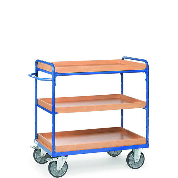 FE-08122 Chariot à caissettes en bois (1 fixe et 2 amovibles) – charge utile 600 kg – 1000 x 700 mm (L x l) surface utile – 1169 x 709 x 1152 mm (LxIxH) dimens. extérieure